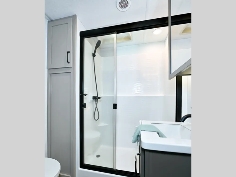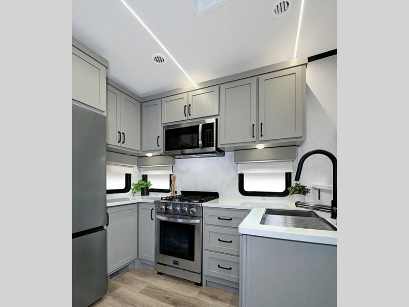 The 8' 5" wide-body provides more interior space to stretch out, and you'll be met with high-end kitchen amenities plus a larger bedroom and bath for a more residential feel. The mandatory Comfort Package includes upgraded residential style hardware, marine grade woven flooring in the slides, and many more luxuries. You'll appreciate the 6-point hydraulic leveling system and the upgraded suspension, along with a tire pressure monitor system and two Quietcool 15K BTU Serenity A/Cs, plus more features within the mandatory Voyager Package!