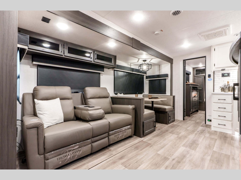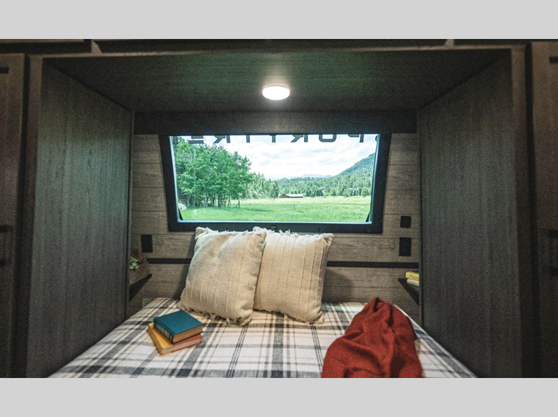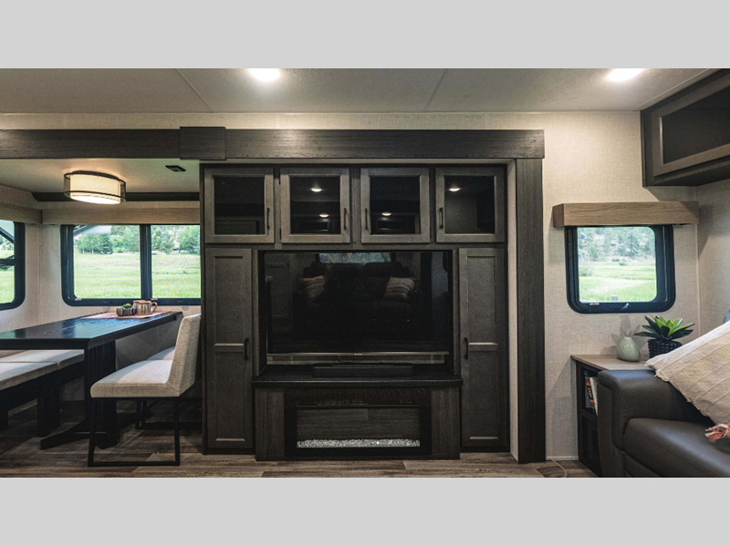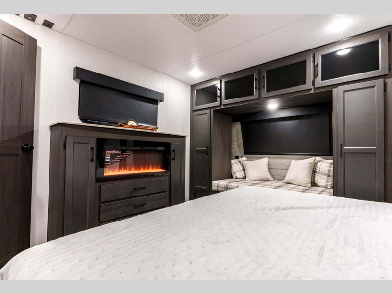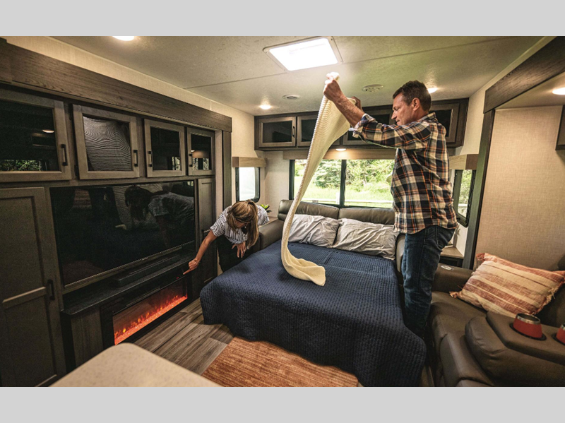A PVC roof membrane covers protects the top of these units and a heated and enclosed underbelly protects the bottom. The RV airflow A/C system increases the 15,000 BTU air flow by an average of 40% for an improved performance, faster cooling time, and reduction of noise. You will also appreciate the 200W solar panel for off-grid capabilities, and the leveling system will have you set up at camp in no-time!